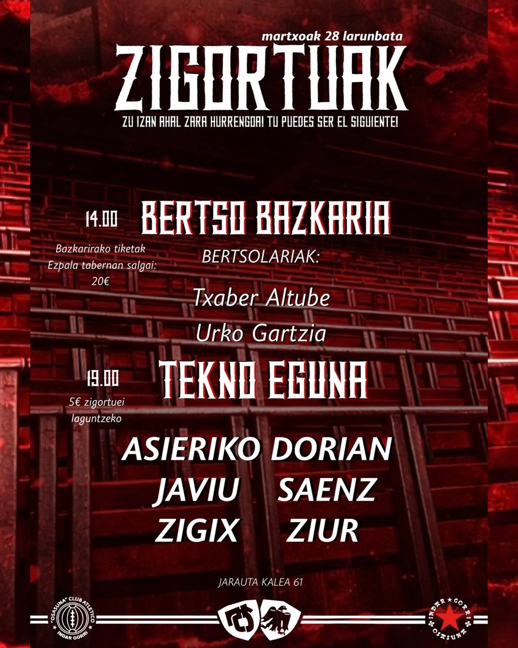 Bertso bazkaria eta tekno gaua zigorutei laguntzeko.